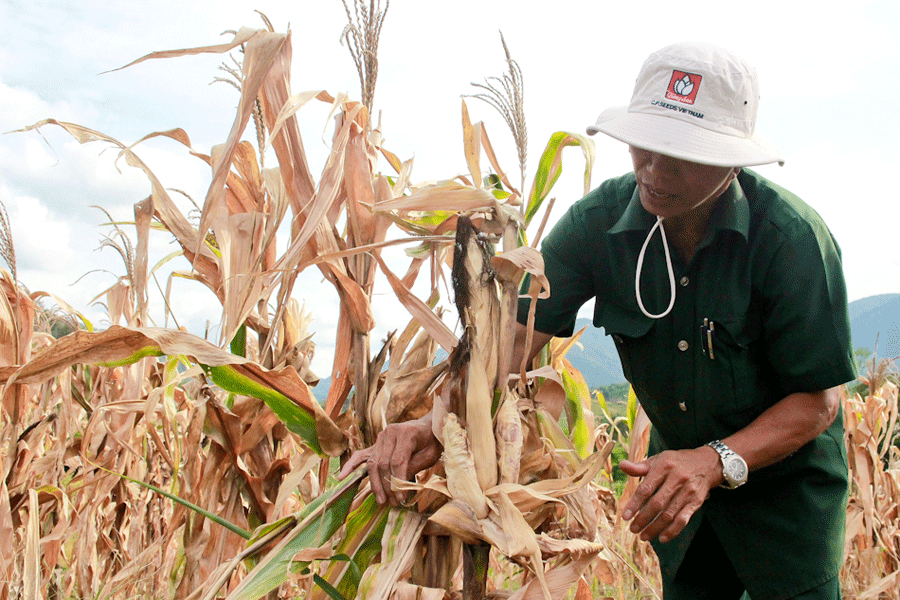 Dẫn chúng tôi đến ruộng bắp 1,5 ha để khô trên cánh đồng của mình, ông Nguyễn Xuân Khoa (thôn 2) lắc đầu ngán ngẩm: 18 triệu đồng đổ vào đó, giờ coi như mất trắng. Cả đám mà chỉ mấy cây cho trái có hạt, còn lại toàn răng cưa và cùi thì thu làm gì cho phí thêm tiền công. Nhìn vào ruộng bắp xanh tốt của nhà tôi, không ai nghĩ là thất thu thảm hại thế này”.