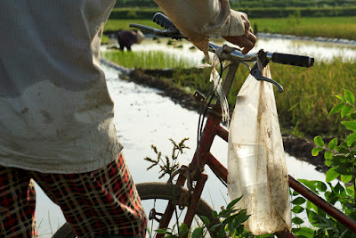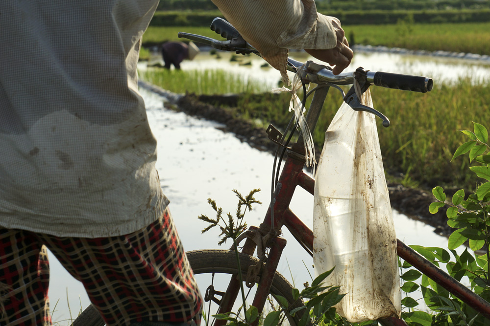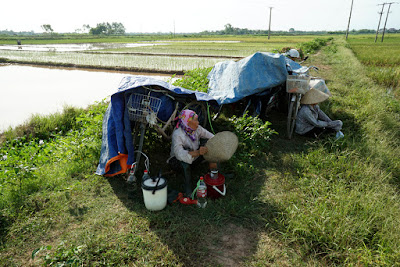 Khi ra đồng làm việc dưới trời nắng, người nông dân phải mang theo 2 chiếc gậy và một tấm bạt để làm lều tạm che nắng mỗi khi nghỉ ngơi uống nước.