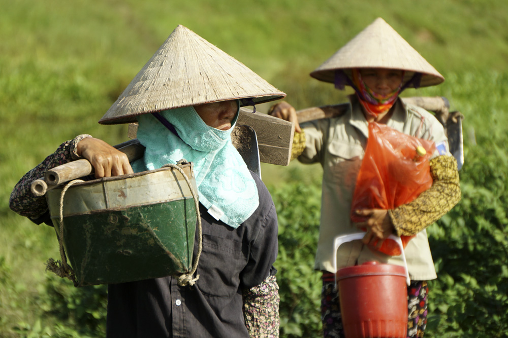Mỗi người khi đi làm đồng thường mang theo khoảng 2 lít nước và mặc rất nhiều quần áo để chống nắng.